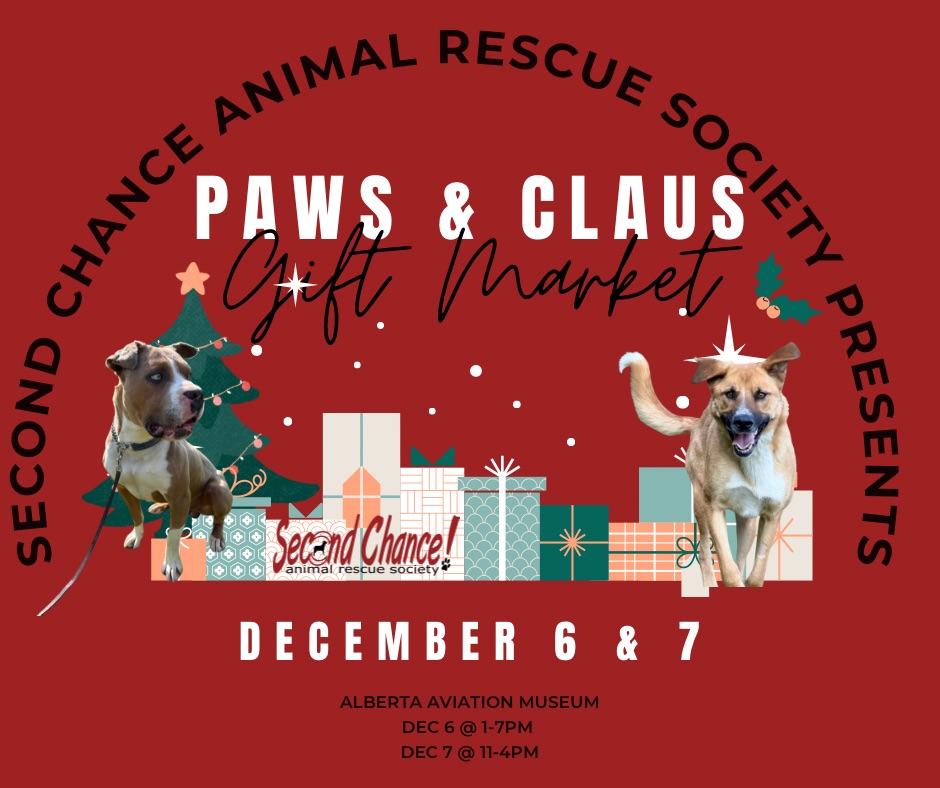 “Save the date” for the Paws & Claus Gift Market for SCARS on December 6 & 7, 2025 at the Alberta Aviation Museum.