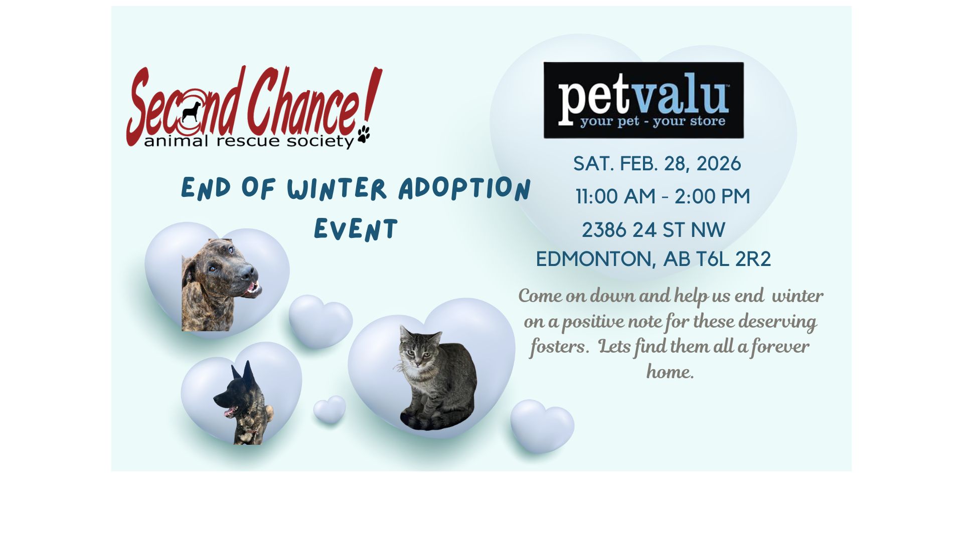 You are invited to the SCARS Adoption Event at PetValu 2386 24 Street on February 28, 11:00 – 2:00